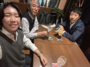 TC課&SP課合同懇親会開催!2025年10月 2025年10月29日 kontecs_staff スタッフのつぶやき コメントを残す 毎週水曜日の生存確認日(出社日)に3人でランチを共にしていますが、このメンツだけで本格的な懇親会は初めてかもしれません。軽くHUBで3杯ぐらいは夏の間に何回かあったかな?基本的に気の良い呑兵衛が集まっているので、明るく楽しい宴になりました。2次会は日本酒バーみたいなオサレなところへ行きましたが、宇宙人に拉致されることもなく、みんな無事に帰宅できましたとさ。めでたしめでたし・・・ 2次会はグラスで日本酒を・・・